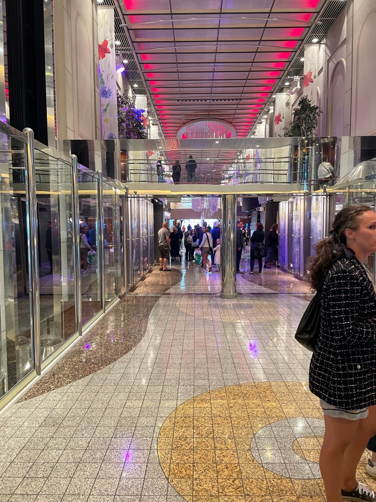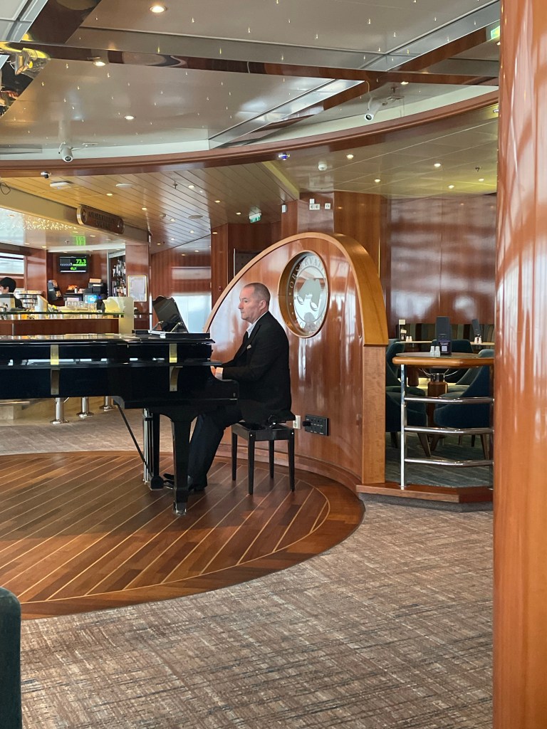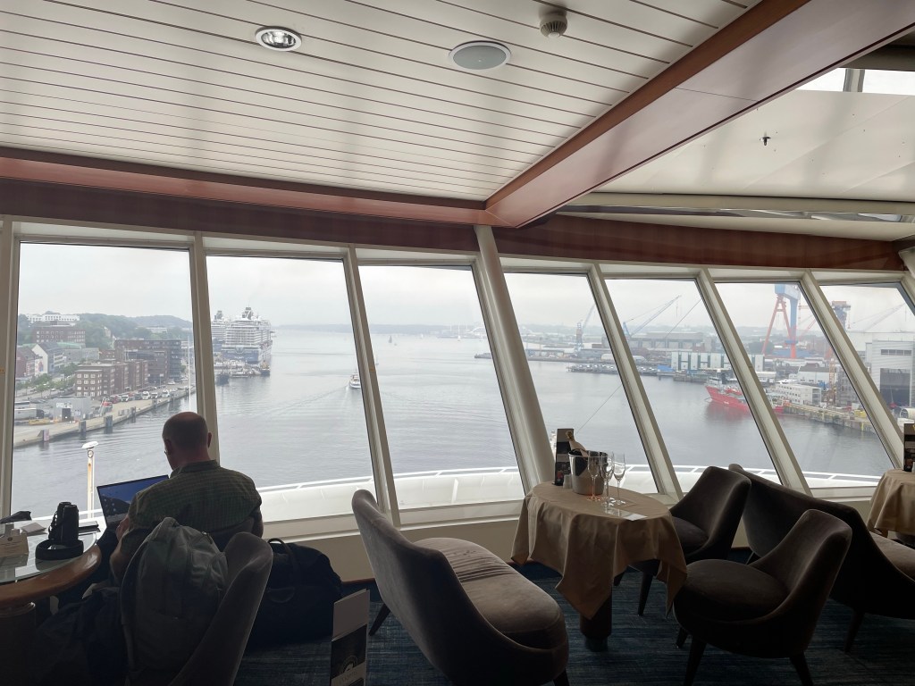 We managed to fit in a short ride to see Hiroshima Park in Kiel, a very pretty and appropriately peaceful spot, before cycling across to Norwegenkai to catch our Oslo ferry. It was a good bit cooler and a little misty – quite a relief after so much heat. And we are now on the ferry, on our way to Oslo – but this is like no ferry I have ever known. To someone reared on CalMac, the North Sea ferry is unimaginable luxury, but the Kiel to Oslo ferry has someone playing a grand piano in the observation lounge where some people are sipping champagne. And there is a promenade with bars, restaurants and shops. There is a spa, a swimming pool and some kind of golf simulator also, although we haven’t explored these so far. This is much more cruise ship than ferry, and I’m struggling to get my head round it. We have blue skies and calm sea, for which I am grateful, but the small yacht that was struggling to get out of the way of the mighty ferry as we left the fjord might have preferred a bit more wind (it made it just in time, though). Onwards to Oslo!
