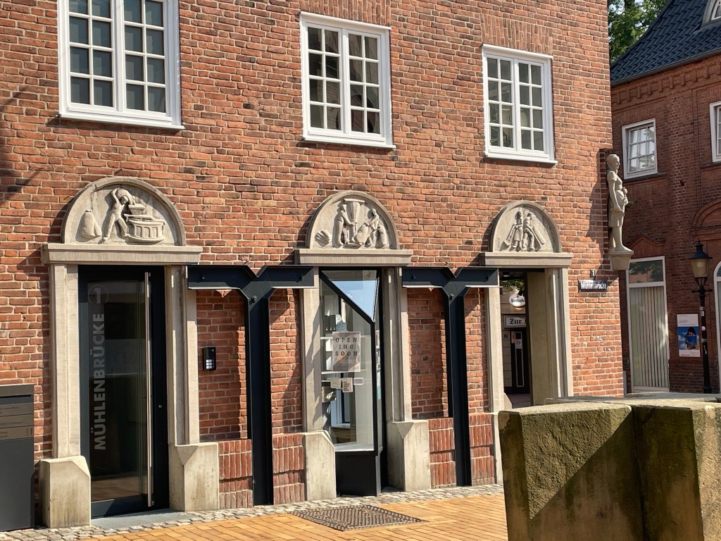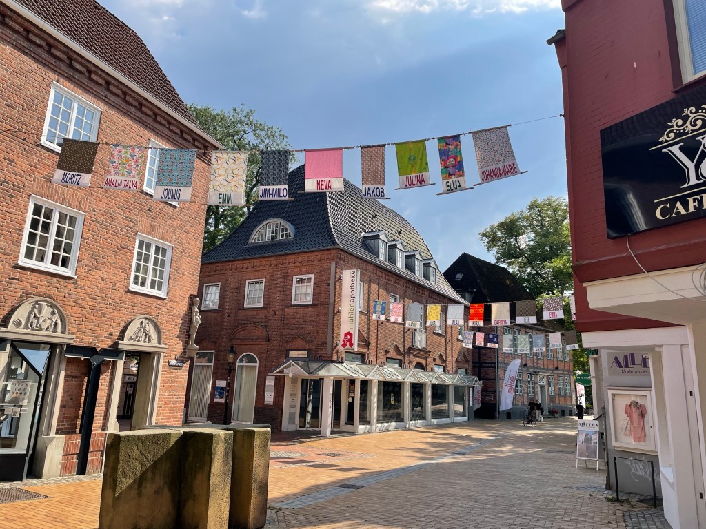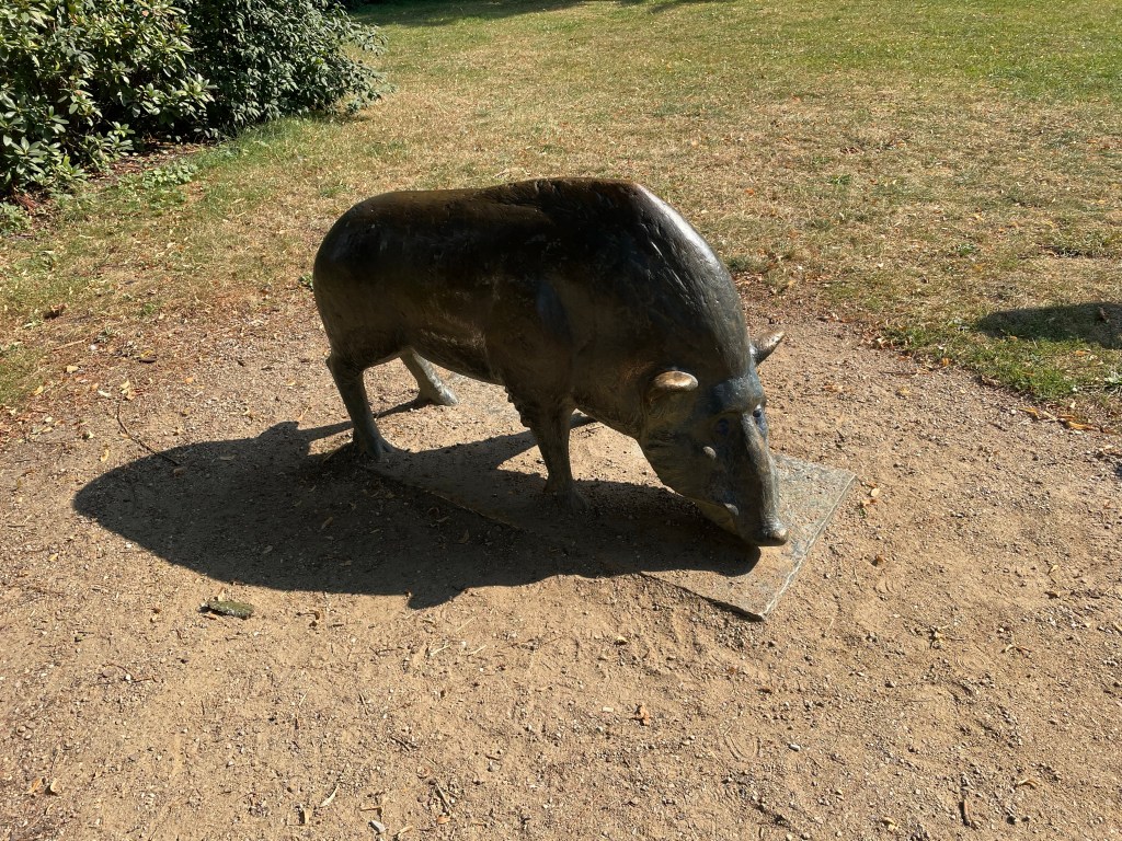 The cycle from Henstedt-Ulzburg to Neumünster was lovely. After the first few urban kilometres, we had a well-surfaced, shady path and could finally get up some speed (note to any roadies reading this: speed by luggage-laden touring standards, not *actual* speed). It was great fun and we made such good time that we were far too early to check into our hotel in Neumünster. We needed cold drinks and bathroom facilities so wound up at a nearby McDonalds for a pit stop – which turned out much longer than intended when a thunderstorm passed over us. Still, we were lucky to be sheltered under the McDonalds umbrella and able to watch the rain in comfort. When it finally stopped, we pedalled off to see a little of Neumünster, which is quite a big town with lovely old buildings and some extremely vicious cobbles. We wanted to visit the sculpture park, which seems to be a major attraction, but it was closed on Tuesdays.