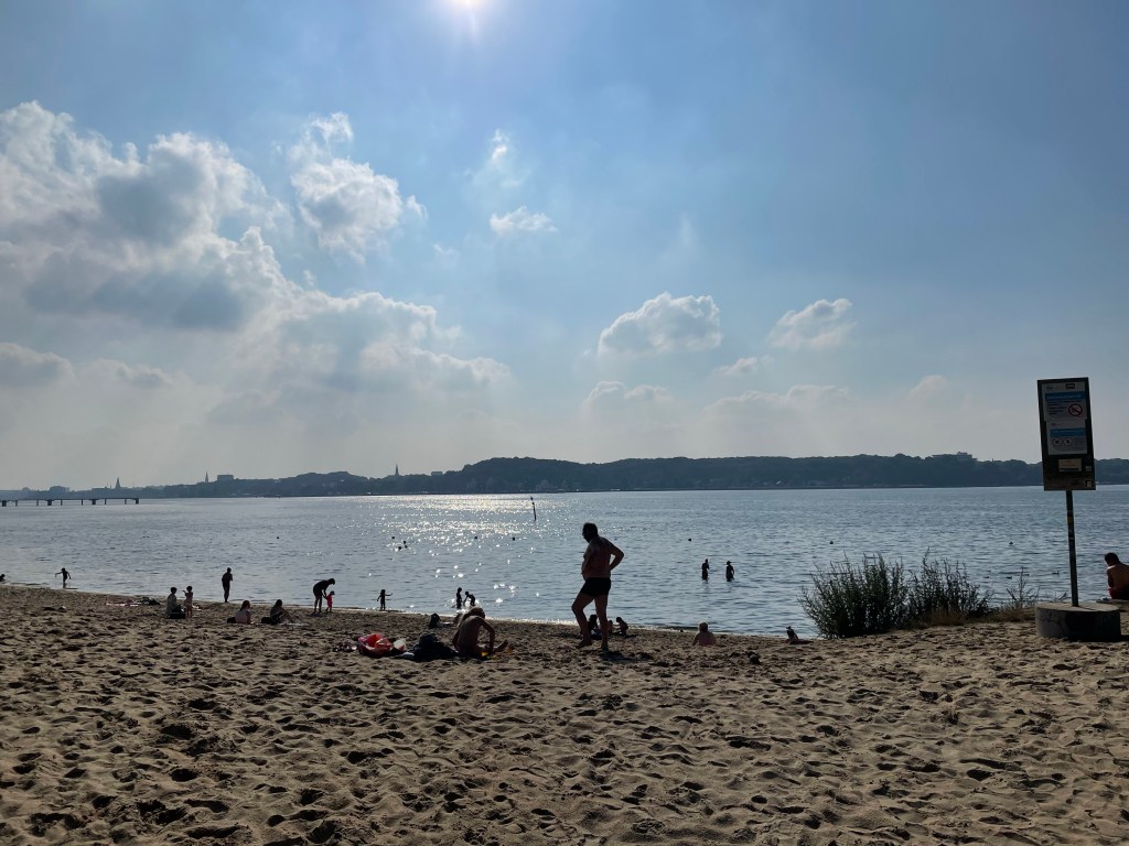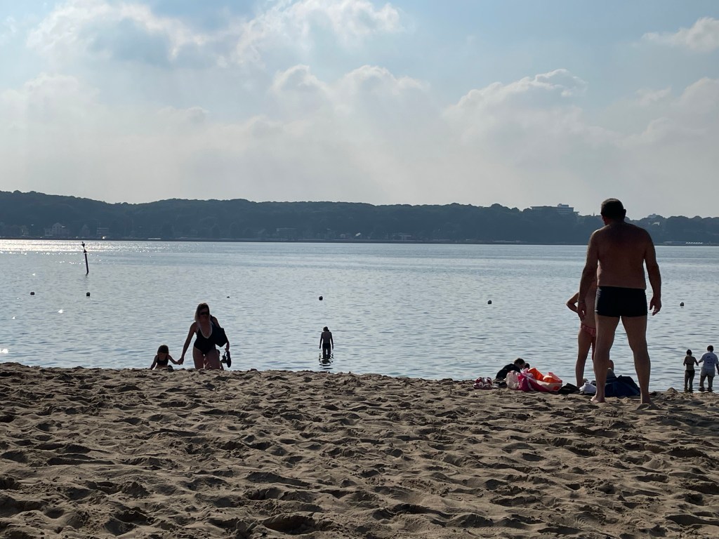 Back on the bus after canal viewing, quick bite of lunch by the main station and then we caught yet another bus out to the east side of the Kiel Fjord and visited a little beach, Strand Hasselfelde, where Bruce finally got his swim. Then back (bus!) to the hotel, and organising things for the remainder of our trip before a late dinner and a tired but happy collapse into bed.